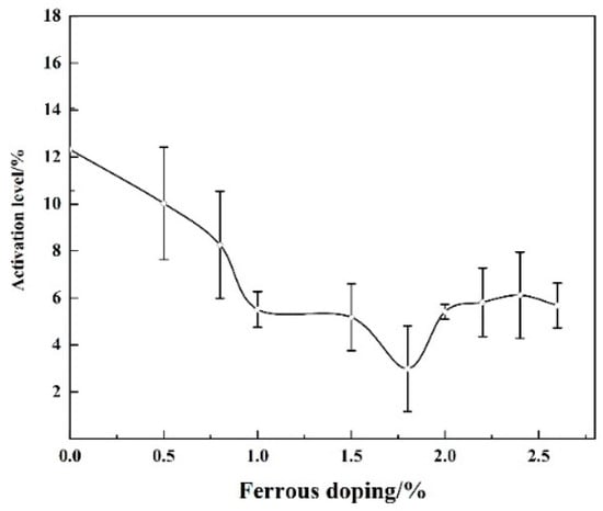 The degree of As activation was low when the ferrous iron concentration was between 2.0 and 2.6% (w/w). Based on the experimental results at days 15 and 45 (a = 15 and b = 45), the formula for the degree of activation was used to evaluate the fluctuation in the stabilization efficiency. The results are shown in Figure 4. As the concentration of ferrous salt increased, a consistent decrease was observed within the range of 0–1.8% (w/w), followed by a gradual increase beyond 1.8% (w/w). This suggests that the influence of the degree of activation was mainly concentrated within 0–1.8% (w/w). The higher the concentration within this range, the greater the degree of activation.