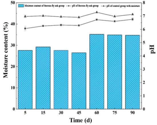 A lower variation in the MC was more conducive to maintaining the stability of soil As. The As concentration in the leachate from the dry sample control group (CK) showed no significant change during the stabilization period, indicating that the pollutants were relatively stable in the dry soil and less prone to migration and leaching. The variation in the MC in the optimal treatment system is shown in Figure 5. The MC of the soil was increased by 10–12% on day 45 to simulate water stress conditions in the soil. A comparison of pre- and post-day-45 results indicates that the change was <4% during days 0–45 and <2% during days 60–90. These findings suggest that the impact of increased moisture on MC is minimal over time. Analysis of pH levels in both the control group with moisture (CW) and the optimally treated group shows a slight increase after 45 days, followed by a gradual decrease toward a stable and neutral state. This suggests that higher moisture levels accelerate the reaction of H+ ions in the soil and facilitate ion exchange, albeit with negligible effects on pH stability. The variation in MC affects the distribution of As forms in the soil environment, thereby increasing the leachable form of As through chemical reactions during the stabilization/activation process.
