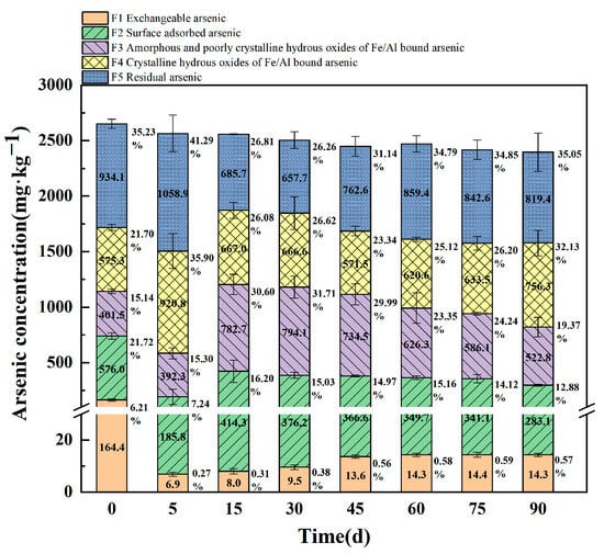 At day 45, the distributions of the F3 and F4 forms decreased due to an 8% increase in the MC. During the 45–90-day stabilization period, the proportions of F2 and F3 slightly decreased over time, while those of F1 and F4 gradually increased. The total distribution of the Fe–As-bound state (F3 + F4) increased by 15.65% before stabilizing, indicating that the optimal system gradually immobilizes the F1 and F2 forms of As in F3 and F4 through iron oxide adsorption, with primary release and transformation occurring between F2 and F3. This underscores that the stabilization of As pollution is achieved through chemical treatment, and the Fe–As-bound state is the major form after chemical processing, aligning with previous research [14,15].