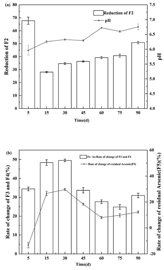 Surface-adsorbed As in the form of F2 was most easily desorbed when the soil pH was between 6 and 7. The pH is the main factor that activates this process. The reduction rate of F2 is shown in Figure 8a. Within the first five days of stabilization, F2 significantly decreased due to the addition of stabilizers. By day 15 of stabilization, the soil pH reached 6–7, resulting in a significant decrease in the reduction rate of F2. As the stabilization progressed, both the reduction rate of F2 and the soil pH gradually increased, indicating substantial desorption of F2 near pH 6 and a gradual decrease in its desorption capacity as the pH increased. These results were consistent with the findings of Goh et al. [40] and Chen et al. [41]. At pH 6–7, surface-adsorbed As (F2) was the most prone to desorption, while at pH > 7, the desorption of As did not show a clear correlation with pH, indicating a stable remediation effect [40,41].