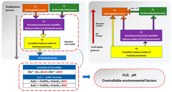 The stabilization process primarily involved the immobilization of exchangeable As (F1) and adsorbed As (F2) into iron oxide-bound As (F3 + F4) and residual As (F5), with the order of stability being F5 > F4 > F3. After stabilization, notable reductions of 50.84% in the F2 concentration and 91.3% in the F1 concentration were observed. Notably, variations in the F1 concentration of the soil were positively correlated with the As concentration of the leachate, highlighting F1 as the principal form influencing the As concentration of the soil leachate, with MC and pH crucially affecting stabilization/activation dynamics. Increased moisture facilitated the desorption and activation of iron oxide-bound As (F3 + F4), whereas a pH range of 6 to 7 caused the activation of adsorbed As (F2). The optimal treatment induced a 12% decrease in soil pH, gradually restoring neutral levels after stabilization. The activation process involved the transformation of F3 and F4 into F1 and F2, respectively.