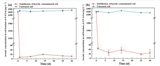 In a 30-day trial in the field, the stabilization efficiency of surface soil (0–0.5 m) for As was 97.41%, maintaining a stable leachate concentration of 2.8 μg·L−1. Similarly, for deeper soil (0.5–1.0 m), the stabilization efficiency for As was 95.37%, with a stable leachate concentration of 5.8 μg·L−1. These results are presented in Figure 10. Throughout the 30-day field remediation process, the stabilization efficiency for As across different soil depths was consistently >95%. Notably, the As concentrations in the soil leachates at all depths met the standards for surface water quality (GB 3838-2002) [51] and groundwater quality (GB/T 14848-2017) [52], which specify Class III limits for As at 0.05 and 0.01 mg·L−1, respectively. These results indicate the efficacy of the remediation process.