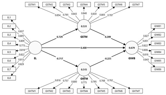 We utilized the partial least squares structural equation modeling (PLS-SEM) path modeling technique with SmartPLS 4 software to analyze the data. PLS-SEM was chosen for several reasons. First, our model is complex, involving multiple constructs and structural paths. PLS-SEM is particularly suitable for relatively new or not well-defined models, making it an ideal choice for our study, which aims to predict relationships between variables [84]. Furthermore, PLS-SEM is widely applied in the social sciences, especially in management, due to its effectiveness in such contexts [85,86]. Another advantage of PLS-SEM is that it does not require data normality and offers the capability to measure unobservable constructs with indicators [87]. Additionally, PLS-SEM is advantageous because it does not necessitate a large sample size [88]. Moreover, PLS-SEM outperforms regression analysis when conducting mediation test analysis [89,90]. The PLS model comprises two interdependent stages: the ‘measurement model’ and the ‘structural model’.