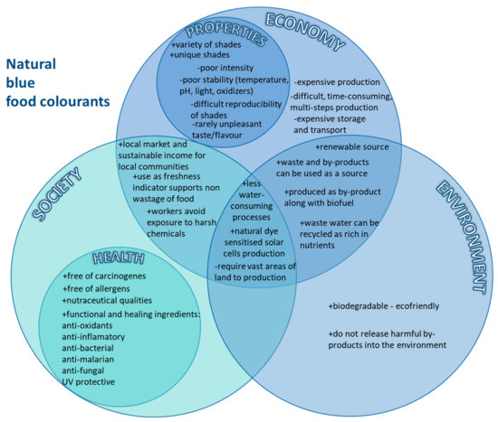 The issues involved in an interdisciplinary approach to the links between economic, environmental, and social relationships are often complex, interrelated, and defined by the characteristics of each compound. Figure 1 presents the most important sustainable correlations between aspects of the use of natural blue food colourants, according to the main pillars of sustainability with the inclusion and attempted positioning of health aspects and properties (Figure 1). Before considering the socio-cultural, economic, and ecological contexts, a brief review of the current state of knowledge on the origin and properties of blue food dyes is necessary to explore aspects that will show us the turning points, which are also linked to health-promoting aspects. To increase the clarity of the work, Figure 2 illustrates a summary of the content of the review (Figure 2).
