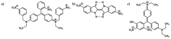 (a) Brilliant blue FCF, (b) indigo carmine, and (c) patent blue V.