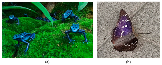In animals, blue colours usually arise from the optical effects of blue light reflected by nanoscale structures rather than from the occurrence of true blue pigment molecules [10,17]. The most exemplary are the blue wings of the butterfly Morpho sp. [40] and the blue feathers of the bird Sialia sp. However, they live mainly in Central and South America. In our part of the globe, i.e., in Poland, it is sometimes possible to observe a butterfly whose wing colour is also based on the same phenomenon. It is a rare purple emperor butterfly (Figure 4b). Similarly, poisonous tree frogs have few natural enemies, and the colour is a deterrent (Figure 4a). The deterrent mechanism is also used by the male moor frog (Rana arvalis) during mating season [41].
