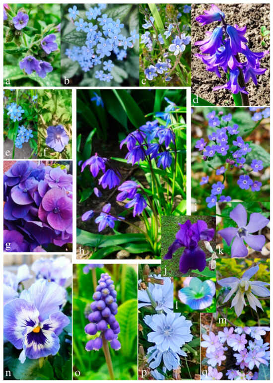 Examples of flowers perceived as blue: (a) Pulmonaria officinalis, (b) Omphalodes verna, (c) Veronica chamaedrys, (d) Hyacinthus orientalis, (e) Myosotis sylvatica, (f) Geranium pratense, (g) Hydrangea macrophylla, (h) Scilla siberica, (i) Brunnera macrophylla, (j) Iris pallida, (k) Vinca minor, (l) Veronica persica, (m) Clematis alpina, (n) Viola tricolor, (o) Muscari armeniacum, (p) Cichorium intybus, and (q) Hepatica nobilis (photo: A. Szmagara).