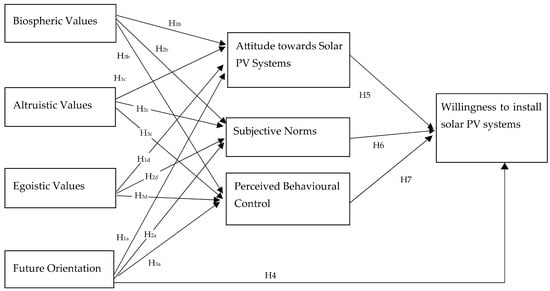Numerous studies have delved into the factors influencing households’ willingness to adopt solar photovoltaic (PV) systems, reflecting a growing interest in renewable energy practices [23,25,26]. While the government’s primary focus for enhancing PV adoption has been on providing economic incentives, scholarly investigations suggest that a range of factors contribute to the adoption of residential solar energy systems. Consequently, this study seeks to delve into the impact of households’ environmental values, future-oriented behaviour, and purchase determinants such as attitude, subjective norms, and perceived behavioural control on their willingness to install solar PV systems.