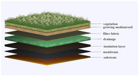 To address these issues, city managers have started to utilize the spaces of building roofs and facades for energy-reducing strategies, considering the land scarcity in urban areas. Among these strategies, green roofs and cool roofs are two of the most popular options because they are environmentally friendly and efficient [10,11]. A green roof refers to a roof covered with vegetation. It can be categorized into three classes based on plant types and abundance: intensive, semi-intensive, and extensive roofs [12]. Extensive green roofs typically feature a variety of herbaceous vegetation and wildflowers (Figure 1). Semi-intensive green roofs combine shrubs and grasses. Intensive green roofs, called “roof gardens,” usually use tall shrubs and trees. Extensive green roofs are more widely used than the other two because they have the lightest weight, the lowest costs on installation, and require less maintenance [13,14]. A typical extensive roof has several layers, including vegetation, growing medium, filter fabric, drainage system, insulation, and substrate layers (Figure 1) [15]. Installing green roofs can reduce energy consumption by maintaining the indoor temperature via thermal insulation, reflecting sunlight, and enhancing evapotranspiration [16]. Compared to cool roofs, green roofs provide extra environmental benefits such as absorbing GHG and air pollutants [17,18], increasing biodiversity [19], and promoting aesthetic benefits and mental health for occupants [20].