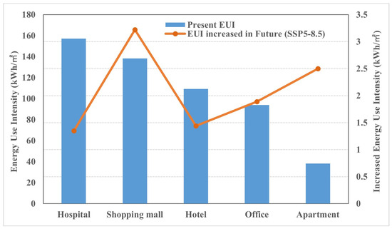 The calibrated average annual building energy-use intensity (EUI) of five types of buildings and the projected increase under future (2049–2051) climate conditions with the SSP5-8.5 emission scenario in Shanghai.
