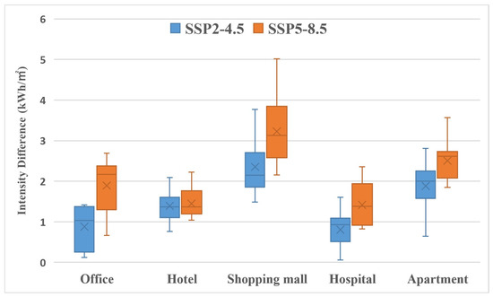 Absolute difference (kWh/m2) in average annual building energy demand of five building types between current (2017–2019) and future (2049–2051) in Shanghai under the SSP2-4.5 and SSP5-8.5 emission scenarios.