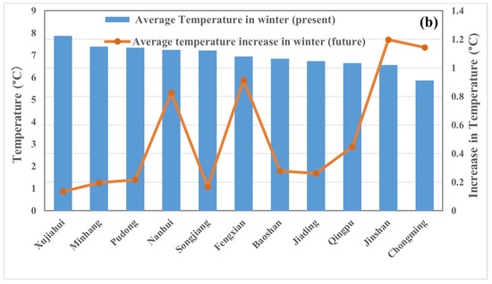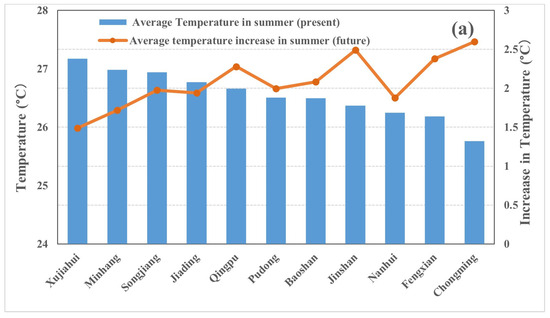 The average temperature of eleven weather stations from 2017 to 2019 and the projected increase from 2049 to 2051 under the SSP5-8.5 emission scenario in (a) summer (June to August) and (b) winter (December to February).