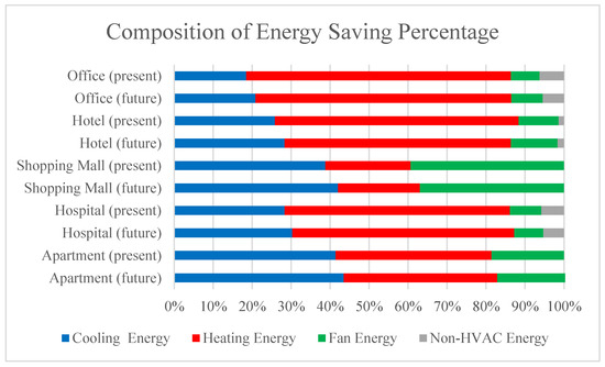Our contribution analysis shows that the most savings in building energy came from the HVAC system, including space cooling, space heating, and fans (ventilation) (Figure 6). In comparison, the savings from non-HVAC energy (humidification, refrigeration, equipment, lighting, and pumps) were trivial. More cooling energy was saved for shopping malls and apartment buildings, while more heating energy was saved for office, hotel, and hospital buildings. With the global warming effect, the savings from cooling energy were expected to account for a more significant portion in the future. When green roofs save cooling energy through thermal insulation, heat absorption, and plant evapotranspiration, they can also reduce energy from fans as a more comfortable and stable indoor temperature requires less air circulation needs in general.