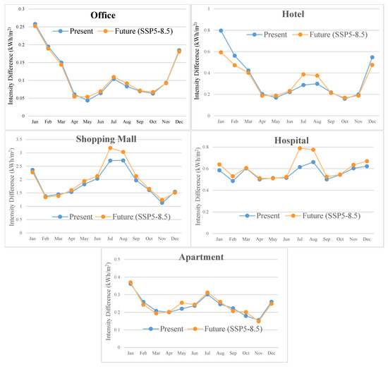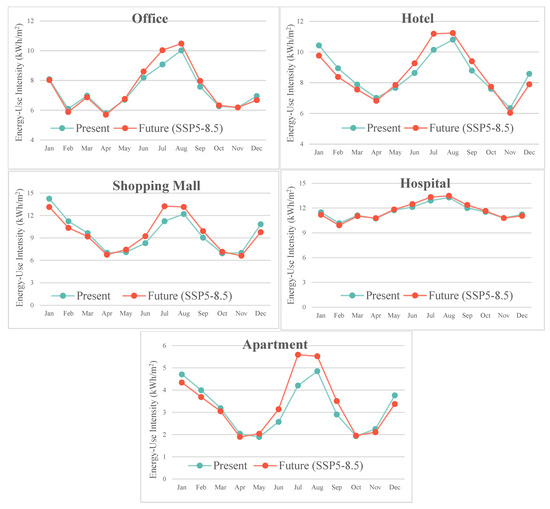 Monthly total energy-use intensity (kWh/m2) of five types of buildings under present (2017–2019) and future (2049–2051 with the SSP5-8.5 scenario) climate conditions.