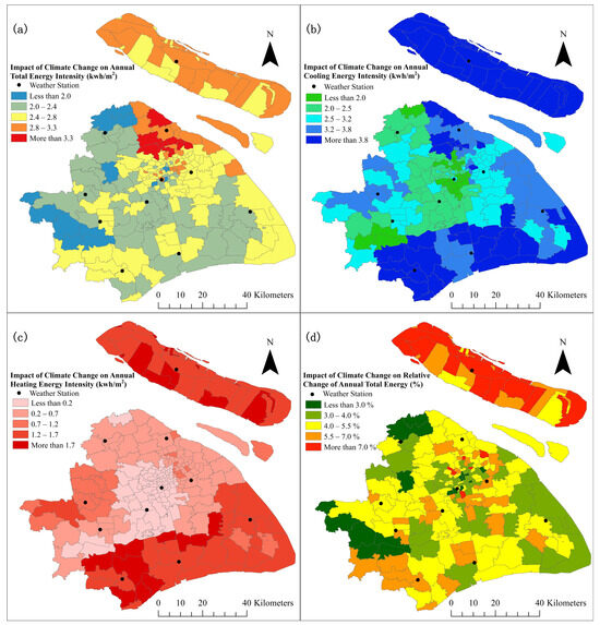 Projected changes in building energy demand in Shanghai during 2049–2051 under SSP5-85 scenarios at the township scale. (a) absolute difference of annual total energy intensity (per unit building floor area, kWh/m2); (b) absolute difference of annual cooling energy intensity (per unit building floor area, kWh/m2); (c) absolute difference of annual heating energy intensity (per unit building floor area, kWh/m2); and (d) relative difference of annual total energy (%).