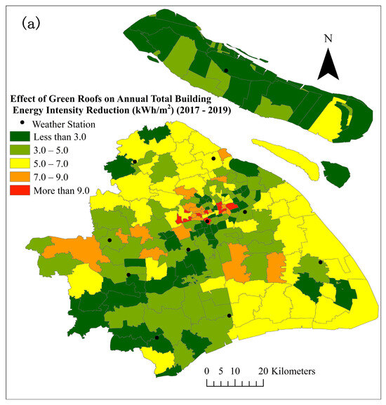 This section presented the spatial distribution of energy-demand change after installing green roofs at the township scale under the present (2017–2019) and future (2049–2051) climate conditions. First, a large variation in AD and RD was observed within the city (Figure 9) caused by climate change. The increase in cooling and decrease in heating were more pronounced in the suburban townships than townships in the urban central area (near the Xujiahui weather station) because of a higher projected increase in average temperature in suburban weather zones, such as Fengxian, Jinshan, and Chongming, in both summer and winter months (Figure 9). Moreover, residential buildings with a high sensitivity to climate change accounted for a higher portion of suburban townships. However, the net increase in annual total energy (AD) in suburban townships was not constantly higher than that in urban central because the increase in cooling energy is partially offset by the decrease in heating energy. Several townships in the Baoshan weather zone exhibited a rapid increase in annual total energy under future climate conditions. This may be attributed to a higher projected increase in summer temperatures compared to winter temperatures in the future (Figure 9b,c). Therefore, they were predicted to have a much higher cooling energy increase (Figure 9b) than a heating energy increase (Figure 9c), leading to a higher net increase in the annual total energy.