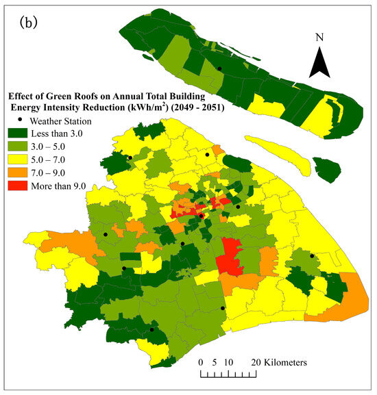 Projected building energy savings from green roofs compared to regular roofs in Shanghai at the township scale: absolute difference of annual total energy intensity (per unit building floor area, kWh/m2) during the period of 2017–2019 (a) and 2049–2051 (SSP5-8.5 scenario) (b).