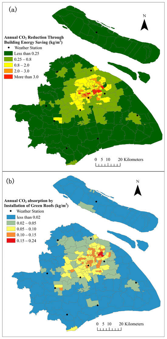 The GHG absorption by green roofs at both the city and township scales is determined by multiplying the area of suitable roofs in each region (the entire city or townships) by the simulated carbon absorption benefits per hectare. Figure 11 shows the spatial distribution of annual CO2 emission reduction per unit area (kg/m2) through building energy savings (panel (a)) and direct absorption (panel (b)) by green roofs at the township scale. Here, only the five types of buildings (office, hotel, hospital, shopping mall, and apartment) with heights of 50 m or less are included. The emission reduction (per unit area) indicates that green roofs can achieve greater CO₂ reductions through plant absorption and building energy savings in central urban townships, where buildings are taller and more densely packed. Our results suggested that if green roofs are installed on all five types of buildings lower than 50 m in the entire city, they could save approximately 1.75 × 103 kt of CO₂ emissions annually through building energy savings during their operation stage. Additionally, under present climate conditions, green roofs could achieve an annual CO₂ absorption of 1.36 × 10⁵ t and produce 3.19 × 10⁴ t C of plant biomass (Figure 12). Furthermore, green roofs could reduce CO₂ under two future climate scenarios through enhanced CO₂ absorption.