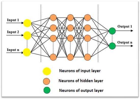 Artificial Neural Networks (ANNs) are machine learning models that mimic the neural functioning of the human brain, capable of learning complex patterns and data relationships. Fundamentally developed as an analogy of how neurons in the brain interact with each other, in recent years, scientists, researchers and decision makers have used ANN methods to predict the amount of electricity consumption in order to contribute to a cleaner environment and sustainability [33,34,35]. ANNs consist of inputs, outputs and one or more hidden layers in between, as shown in Figure 4. The input layer provides external data to the ANN, which are then transmitted to one or more hidden layers. These hidden layers perform various transformations and calculations on the data, serving the functions of feature extraction and pattern recognition. Each neuron processes the incoming data with weights and a bias value. These weights are continuously adjusted and optimized during the training process. The outputs of the neurons are generally processed by an activation function, ensuring that the output falls within a specific range. The output layer receives processed information from the hidden layers to generate final predictions or classifications. During the training process of ANNs, the weights are updated to minimize the difference between the network’s predictions and the actual values. At the end of the training process, the ANN has learned the data relationships for a specific problem and becomes capable of making predictions.