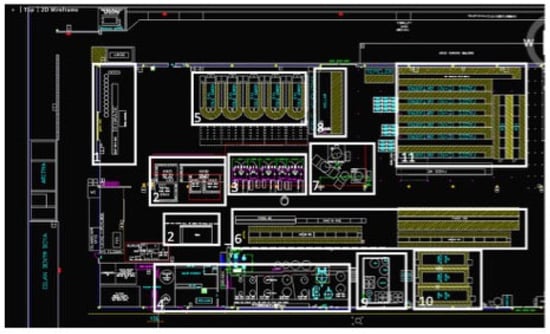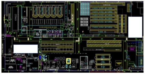 Proper layout and material flow management improve production processes and reduce costs. It also allows for the production of higher-quality products by increasing worker efficiency. Therefore, layout optimization should be given significant importance in the design and operation of yarn dyeing facilities. Considering these reasons, a dyeing facility of a factory producing for the four critical markets of the textile sector—carpet, home textiles, knitwear, and hand knitting—has been examined. In this facility, yarns are dyed in bobbin, vat hank, arm hank, and gradient dyeing styles, and the workflow is created depending on the order and process. The workflow diagram that has been created lays the foundation for analyzing the production operations and material flow process of the enterprise. Following the creation of the workflow diagram to enhance efficiency through optimizing the layout plan, the current machine layout plan has been drafted as shown in Figure 6.