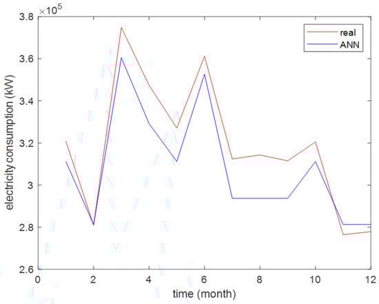 The results obtained from the ANN method are shown in Figure 10. In the graph, the curve represented in red indicates the actual consumption values for the year 2022. The curve depicted in blue represents the predicted values for 2022 as forecasted by the ANN method. Upon examining the results, it is observed that, despite the high error value in the first curve, there is a tendency to capture the actual value at peak points.