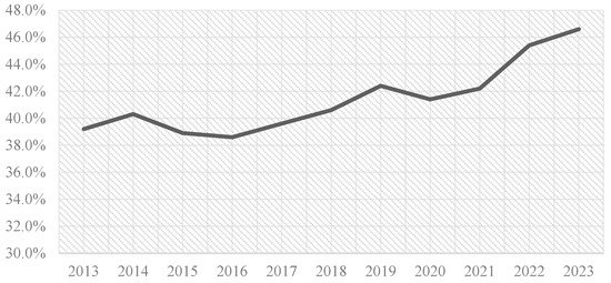 Share of China’s imports and exports with the Belt and Road Initiative partner countries in China’s total foreign trade. Data sources: website of the xinhuanet, The Belt and Road Initiative: A Key Pillar of the Global Community of Shared Future (http://www.xinhuanet.com/2023-10/10/c_1129907870.htm, accessed on 19 March 2024).