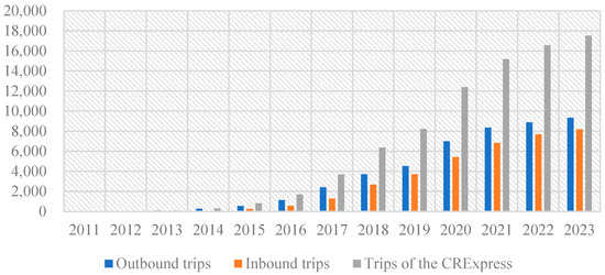 Trips of the CRExpress. Data sources: website of the Belt and Road Portal (https://www.yidaiyilu.gov.cn/numlistpc.htm, accessed on 10 August 2023), website of CRExpress Portal (https://www.crexpress.cn/#/allTraffic, accessed on 1 March 2024).