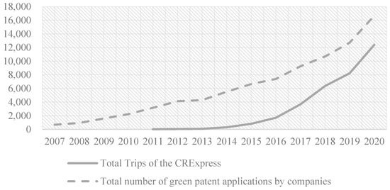 Development trend of the CRExpress and enterprise green innovation. Data sources: website of the Belt and Road Portal (https://www.yidaiyilu.gov.cn/numlistpc.htm, accessed on 10 August 2023), CNRDS database.