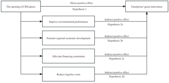 In the following text, we will theoretically analyze how the opening of CRExpress directly and indirectly affects the green innovation of enterprises. The research conceptual framework is shown in Figure 4.