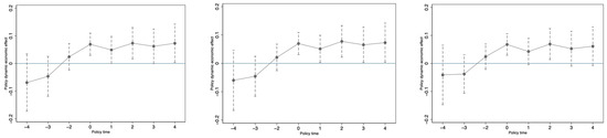 It is a necessary prerequisite for the control group and the treatment group to maintain a parallel trend before the policy occurs. Therefore, we draw on the method of Wang and Bu (2019) [13], and use the year before the opening (pre1) as the base period. We use the dynamic DID model to analyze the dynamic effect of the opening of the CRExpress on the green innovation of enterprises. The results are shown in Figure 5. Before the opening of the CRExpress, the coefficients of the interaction terms are not significant, indicating that there is no significant difference in the level of green innovation between the control group and the treatment group before the opening, which supports the parallel trend hypothesis.