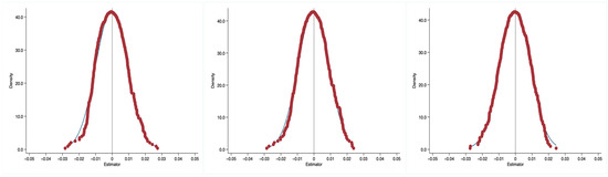 Among them, z includes all other control variables and fixed effects, and γ represents non-observable factors. If the value of γ is 0, it is proved that β is unbiased. In this paper, let the impact of the opening of the CRExpress on enterprises become random, and then this process is repeated 500 times, which can ensure that βrandom is 0, and the distribution of βrandom can be presented in Figure 6. It can be seen that the with the radius of 300 km, 350 km and 400 km is distributed near 0 and obeys the normal distribution, so the previous conclusion is proved to be robust.