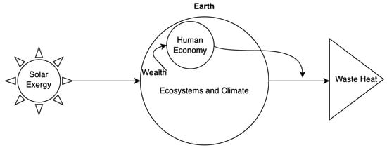 Of course, humanity can attempt to store this flow energy physically in batteries or behind dams, or by capital accumulation; however, capital decays, and storage is vastly insufficient. Infrastructure and capital development, rather than being seen as wealth itself, are seen in the Soddian framework as “aids and accessories in the maintenance and increase of wealth out of the available revenue of energy” ([1] p. 14). To illustrate our view of wealth, we diagram the earth system as a heat engine, with earth having developed processes to consume the available solar energy while expelling waste heat at the temperature of the cosmic background radiation, see Figure 2. The input into this system is wealth, or “available energy usefully directed” [1] (p. 13). In modern times, the renewable flows of solar energy have been dwarfed by the contribution of fossil energy (Figure 3). Importantly, the rates of solar energy flows and the utilization of fossil stocks are finite; thus, so too are our economies.