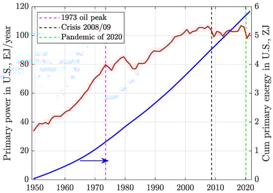 Primary power (red) and cumulative primary energy use (blue) in the US. Notice the astronomical amount of mostly fossil energy already burned in the US; 1 ZJ = Joules.