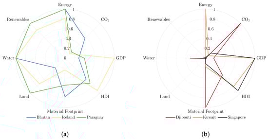 Eight-dimensional (octagonal) mapping of the sizes of different economies: (a) the resilient countries fill large areas of the octagon; (b) for the vulnerable countries, only small areas of the octagon are filled. Reference year: 2015. Reproduced from Figure 4 in [44].