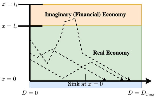 The gradient of an economic potential () generates random walks (dashed lines) in real and imaginary economic space (, ). This behavior is what gives rise to our continuous diffusion model in Figure 6. We consider cumulative GDP to be the integral of the flux of into the sink at . Note that in our analysis we do not differentiate lending to the financial vs. real sectors of the economy; this a possible extension of the present work.