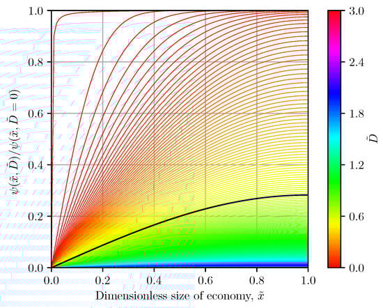 Economic growth potential is depleted by human activities that consume the available free energy endowment and create more population, goods, and services, in short, GDP[]/CPI. In our model, we assume that the cumulative GDP is an integral of the free energy extraction at integrated over all debt. For the time being, we consider that = const; however, in reality we expect to be a function of time. As diffusion dissipates the potential over a finite space , the GDP reaches an upper asymptote GDPmax. Thus, in the end the efficiency of debt conversion to GDP approaches zero. This is the limit of the readily available high-free energy resources. The other boundary of the economy at is insulated in this paper. The economy can be thought of as an insulated rod with one open end in which the heat can flow out (we have included a comparison of heat diffusion and economic potential diffusion in Figure A1). This ensures that the economic potential is not replenished; see the spatial evolution of in Figure 6.