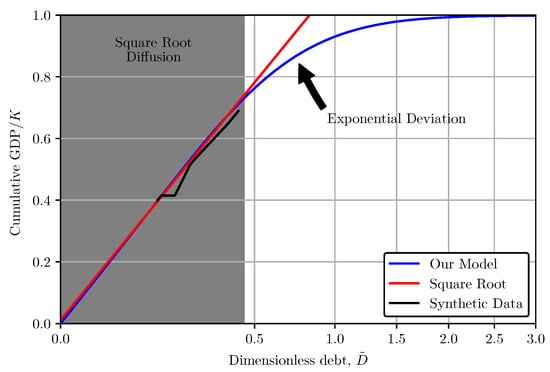 Steep increases in slope from the square root seem to be associated with economic crises. This phenomenon appeared in Finland during the 1990s, aligning with their banking crisis (Figure 9b) [60] and in Japan coinciding with the “Lost Decades” of economic stagnation. The curves for Greece, Portugal, and Hungary also steepen after the 2007 financial crisis, during which the IMF and European Financial Stability Facility conducted bailouts for some European countries [61]. Removal of “bad” debt from the system likely follows this trajectory, whether through default or through the purchase of debt from an outside agency (IMF or Federal Reserve) in exchange for vertical money (see [40], Section 2.8 for more on schemes to remove bad debt from the system). Examining the conditions under which this phenomenon appears and the circumstances in which the economic trajectory returns to the square root diffusion will be an interesting extension of the present work.