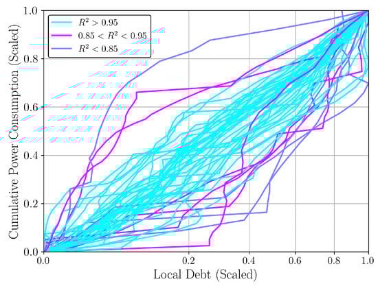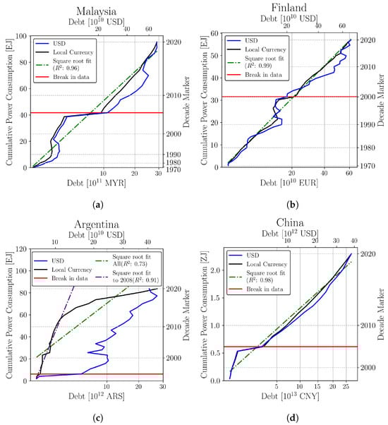 (a) The Malaysian power–debt diffusion graph contains a horizontal artifact caused by the unavailability of Household and Non-Financial Corporation Debt in the BIS data series prior to the break (Red). (b) During the 1990s, power consumption increased rapidly in Finland, with little debt increase. Note that this period was preceded by rapid borrowing. Following the 1990s, the debt–power relationship returned to a square root function. General Government debt is not included before the break (Red). (c) Argentina’s economy was following the square root diffusion pattern () until 2008, at which point there was exponential deviation from the curve, signifying the devaluation of the local currency. At the same time, use of the US dollar became more widespread [59]. (d) China’s power consumption vs. debt follows a square root function closely. The fit is 0.98.