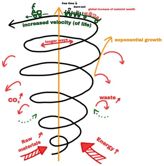 Just to be clear on that sticking point, if the entire population of our planet, which currently stands at around 8 billion (with an upwards tendency) aspires to live the American lifestyle—not just the one of today but also of tomorrow—then our demand for energy and materials will simply explode, and not even the moon will be enough to cover our material needs here on Earth. In mathematical terms, an annual increase of 3% does not result in a “little extra” year by year, it triggers rapid growth (1.03years) and doubles our economic activities every 20 or so years. This is quite a significant number since the demand for raw materials and energy, and the waste produced, will also increase considerably in parallel, as illustrated in Figure 1. As the American economist Kenneth Boulding succinctly put it, “Anyone who believes that exponential growth can go on forever in a finite world is either a madman or an economist” []. And this does not even address the more social and individual distortions which will follow suit.