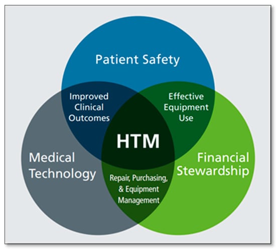 The Association for the Advancement of Medical Instrumentation (AAMI) defines Healthcare Technology Management (HTM) as the discipline dedicated to overseeing the selection, maintenance, and safe utilization of all health technology and medical equipment in healthcare settings []. AAMI has also provided a diagram (Figure 1) that illustrates how HTM roles and responsibilities intersect within the healthcare environment [].