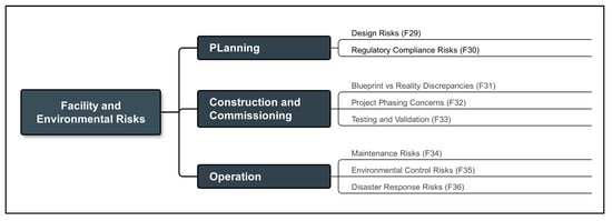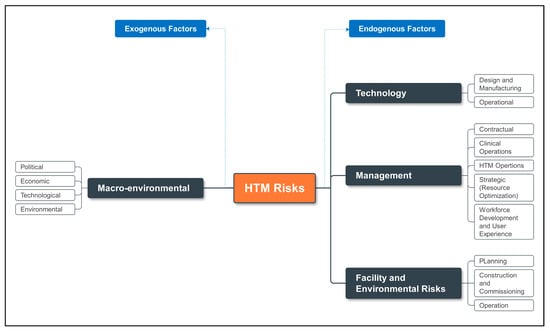 A comprehensive conceptual diagram was also created to offer a detailed view of the various risk sources, including technology, management, facility and environmental, and macroenvironmental factors (Figure 8). This diagram aimed to pinpoint all potential threats that might adversely affect the HTM’s performance.