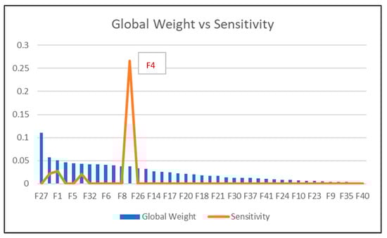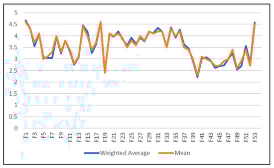 In Figure 7, the two lines represent the mean and the weighted average for each risk factor, demonstrating a close alignment between the two metrics. This proximity corroborates the reliability of the expert weighting criteria utilized []. Risk factors with weighted average (W avg.) values below 3 were excluded from further analysis due to their lesser significance, and these excluded factors are denoted in yellow in Table 2.