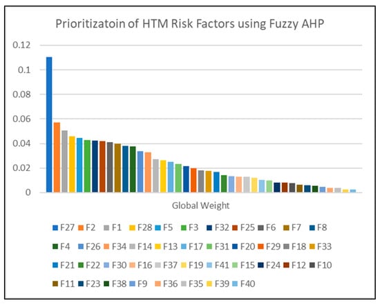 The data in Table 3 rounded to four decimal places, were derived from an AHP questionnaire that a group of HTM experts answered. The fuzzy weights for the criteria and sub-criteria were determined using Chang’s extent analysis method [], as outlined in Equations (1)–(3). These equations were solved using a Python code (https://www.python.org/), within the Colab environment, developed specifically to implement Chang’s method. Table 4 displays the linguistic terms alongside their corresponding weights. The calculated global weight values are displayed in both Table 4 and Figure 10.