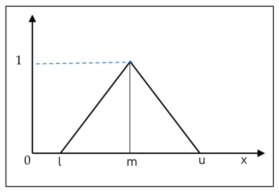 M is characterized as a triangular fuzzy number (TFN) with three parameters (l, m, and u), as shown in Figure 11. Si represents the synthetic extent value derived from pairwise comparisons. In this context, Ai is the ith element and d′(A1), …, d′(An) are the priority weights computed using Equation (2) prior to their normalization. W is considered a non-fuzzy number.