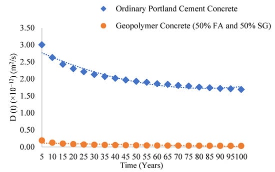 In this study, (m) represents the age factor, (Do) denotes the apparent chloride diffusion coefficient, (t) is the exposure time in years, and (to) is the reference time, corresponding to 28 days (equivalent to 0.0767 years). The values for m and Do were derived from the experimental research by Tennakoon et al. [50]. Specifically, for the GPC mix composed of 50% FA and 50% SG, the age factor m is 0.604, while for ordinary OPC concrete, it is 0.192. The apparent chloride diffusion coefficients were reported as Do = 2.38 × 10−12 m2/s for the GPC mix with 50% FA and 50% SG and Do = 6.70 × 10−12 m2/s for OPC concrete.