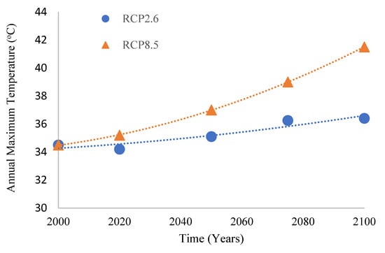 Projection of the annual mean maximum temperature for Toronto under RCP2.6 and RCP8.5 [57].