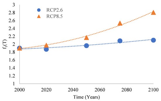Temperature influences on the diffusion coefficient: The factors for temperature are based on the Arrhenius equation, as shown in Equation (7), which highlights the exponential relationship between temperature and its factors over time. The significance of this relationship is presented in Figure 5, which plots temperature factor variations against future years under RCP2.6 and RCP8.5, with RCP8.5 showing the greatest temperature influence.