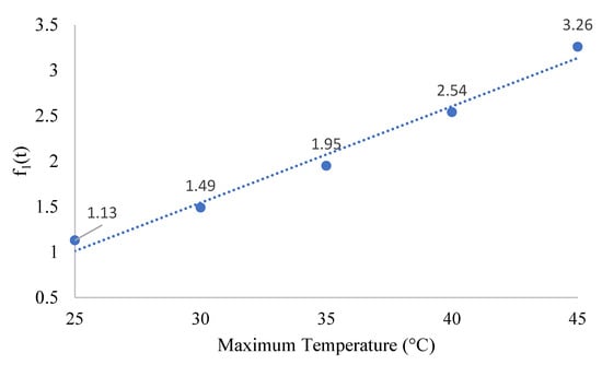 The impact of the annual maximum temperature ranging from 35 °C to 45 °C, which represents the high emission scenario (RCP8.5) for the annual maximum temperature in 2100 for Toronto City, on the probability of chloride-induced corrosion initiation was evaluated in this research for RC bridge decks made of GPC. Furthermore, the influence of the annual maximum temperature ranging from 25 °C to 34 °C, which represents the low emission scenario (RCP2.6) for the maximum temperature in 2100 for Toronto City on the PCI, was deduced for the same type of concrete as mentioned previously. Furthermore, the factors of the maximum temperature (see Figure 6) were obtained versus the corresponding maximum temperature via Equation (7), which is reflected in the chloride diffusion coefficient for a GPC at a certain time.