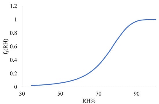 where T1 is the reference temperature (296 K), T2 (K) is the target temperature, and Ea is the activation energy of diffusion (kJ/mol) influenced by the water-to-cement ratio of the concrete, in this study, the water-to-cement ratio of 0.4 was utilized with an associated activation energy of 41.8 kJ/mol according to Page et al. [71]. R is the gas constant (8.314 × 10−3 kJ/mol), and te represents the actual time of exposure to chloride (days), according to Saetta et al. [27]. ξ is a factor indicating how much diffusivity decreases over time, ranging from 0 to 1. According to Saetta et al. [27], the ξ parameter is assumed to be near 1 for concrete with a low water-to-cement ratio. RHc, as defined by Bazant and Najjar [72], is assumed to be 75%, while RH denotes the current pore relative humidity.