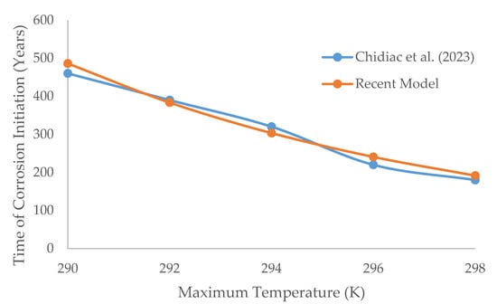 The time of corrosion initiation for a GPC consisting of 50% FA and 50% SG versus temperatures ranging from 290 K to 298 K was validated in this research for a concrete cover thickness of 50 mm, as shown in Equation (13). This equation illustrates the effect of the maximum temperature factor f(t) on the chloride diffusion coefficient of the GPC mixture. The results indicate that the corrosion initiation times predicted by the current model closely align with those obtained by Chidiac et al. [76] for the same type of GPC across various maximum temperatures, as depicted in Figure 9. The percentage error in the corrosion initiation time (Ti) between the current model and Chidiac et al.’s model remains within an acceptable range.